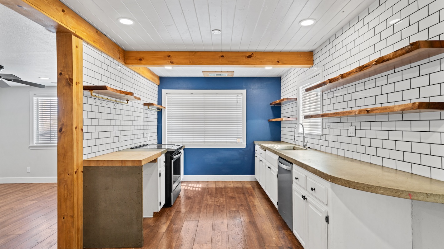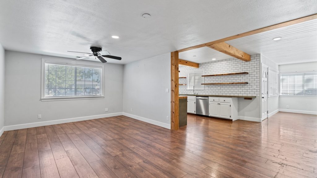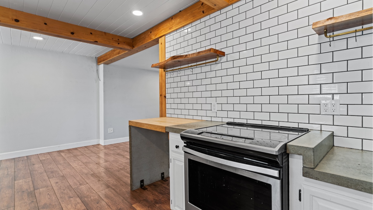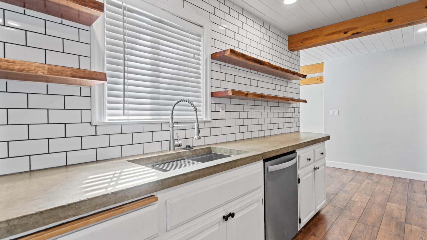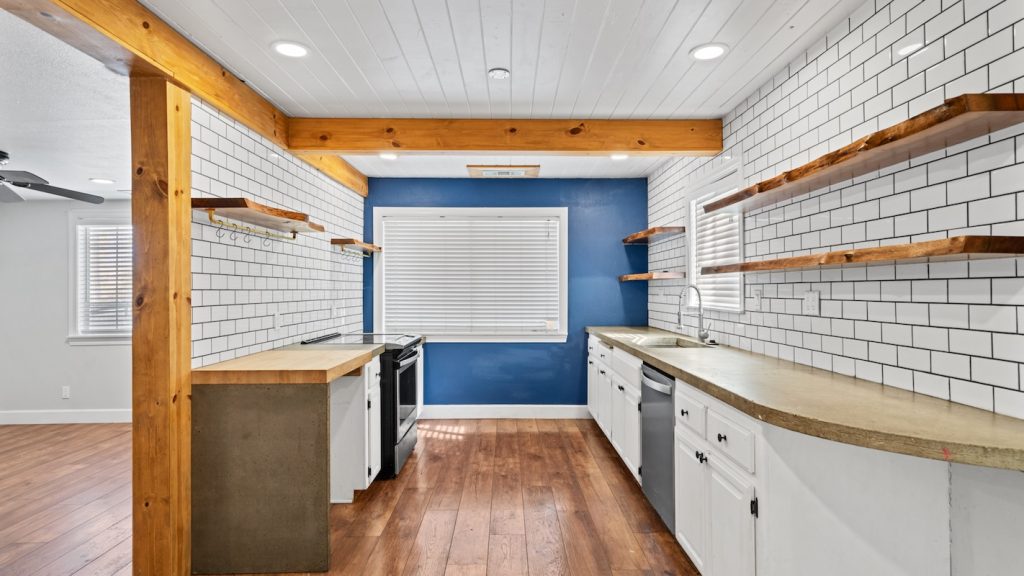 The remodeled kitchen is the heart of the home, featuring concrete countertops, a butcher block work area, a deep sink with a modern faucet, and a layout that opens beautifully to the living space—perfect for everyday life and casual entertaining. You’ll also love the formal dining room for gatherings, plus the convenient indoor laundry closet.