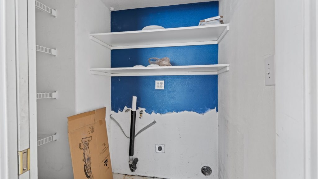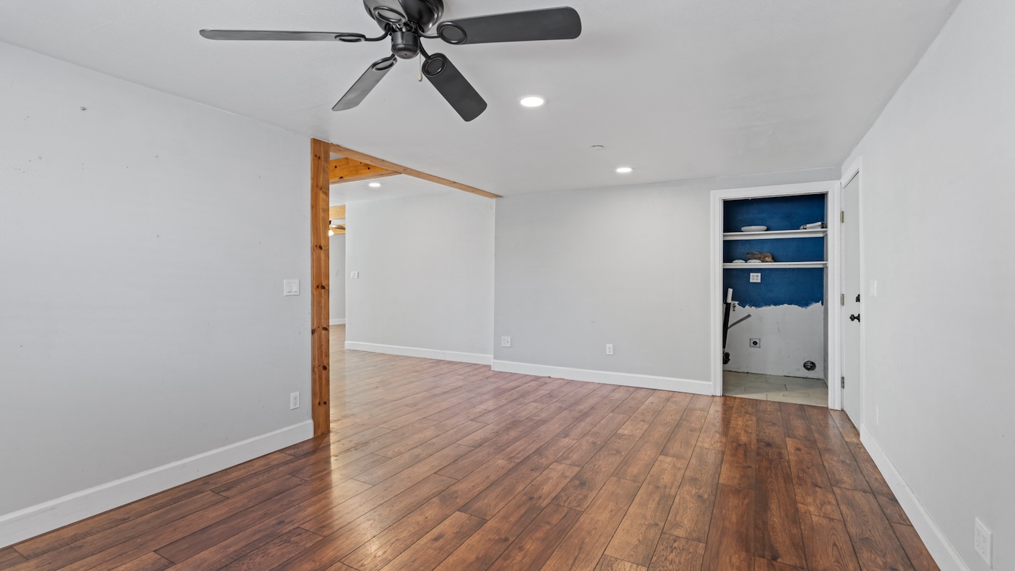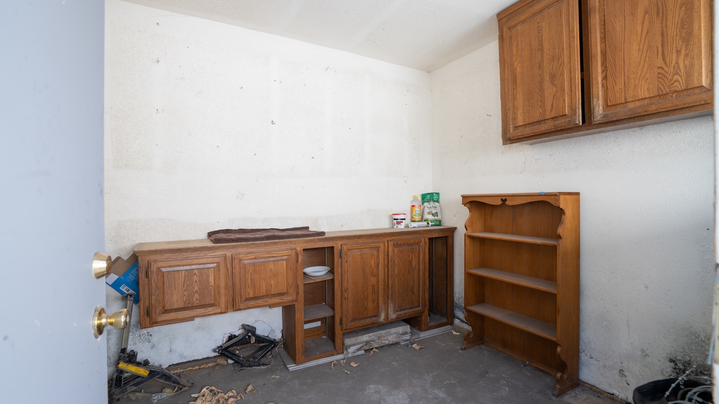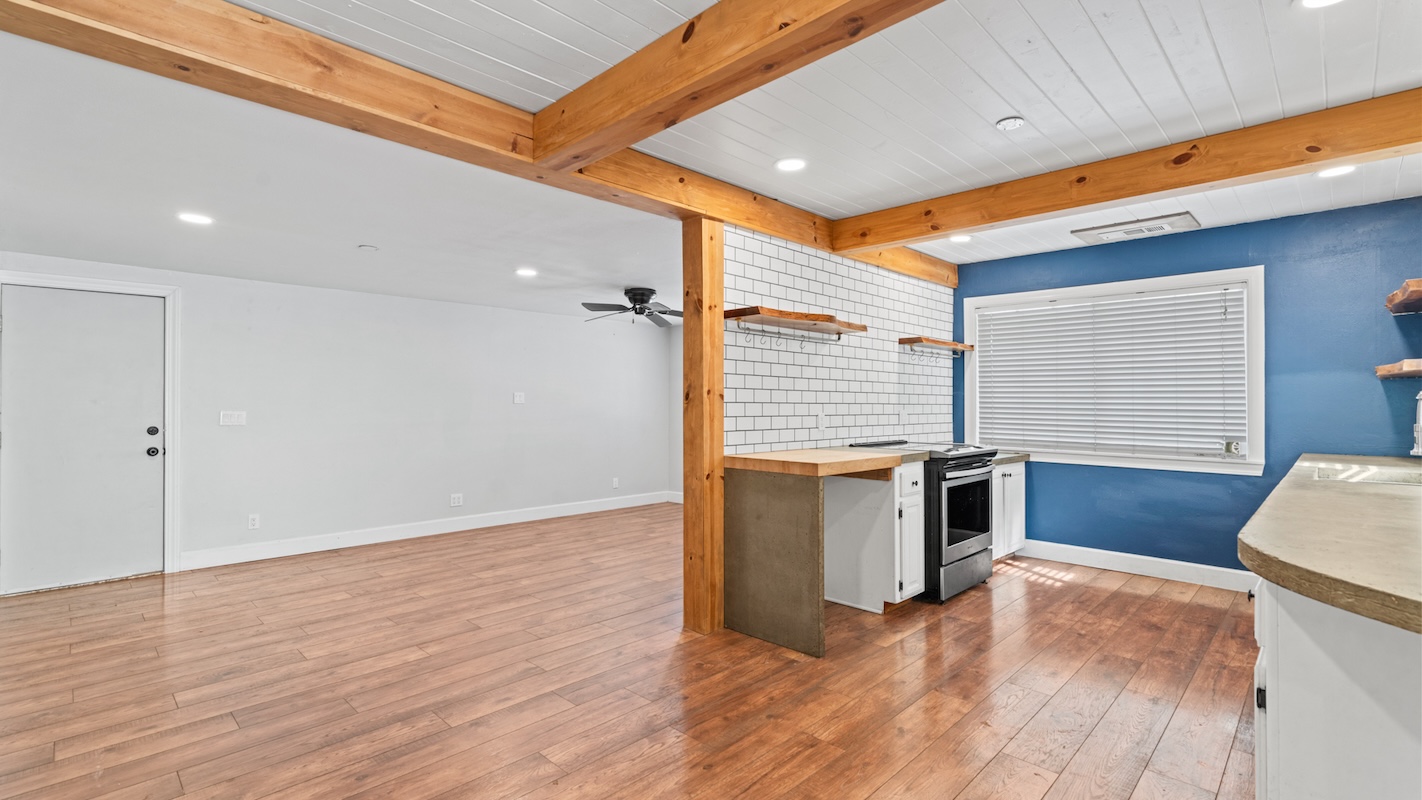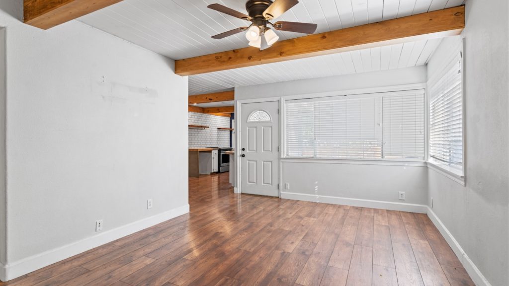 The remodeled kitchen is the heart of the home, featuring concrete countertops, a butcher block work area, a deep sink with a modern faucet, and a layout that opens beautifully to the living space—perfect for everyday life and casual entertaining. You’ll also love the formal dining room for gatherings, plus the convenient indoor laundry closet.